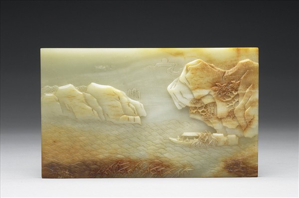 玉質泛褐,有白色綹紋。一面浮雕二文士泛舟遊於山壁之下。蘆草微傾,似有清風徐來。薄留玉皮以為山岩與秋葉之色。另一面則陰刻填金清高宗書蘇軾〈赤壁賦〉,款「御臨於三希堂」及「比德」、「朗潤」二印。