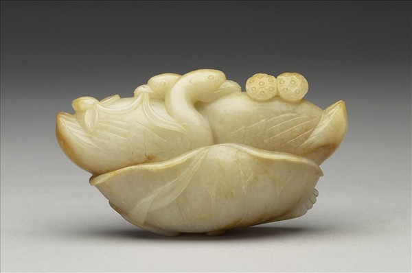 白玉,帶灰,雜赭斑,器身有璺。全器雕一大片荷葉,雙鳧坐臥其中,口銜蓮花、蓮蓬。