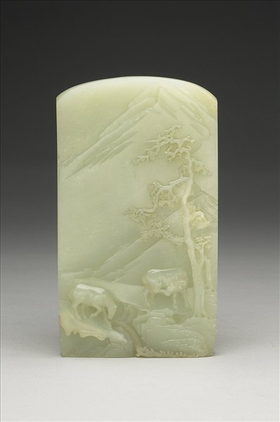 玉質。一面浮雕駿馬兩匹:一樹旁休憩,一溪畔飲水,狀甚悠遊。另面海日初昇。布局疏朗。
