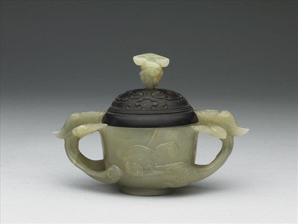 青玉質,器身有璺。圓口,弧腹,圈足,腹側飾獸首鋬,附玉頂木蓋。