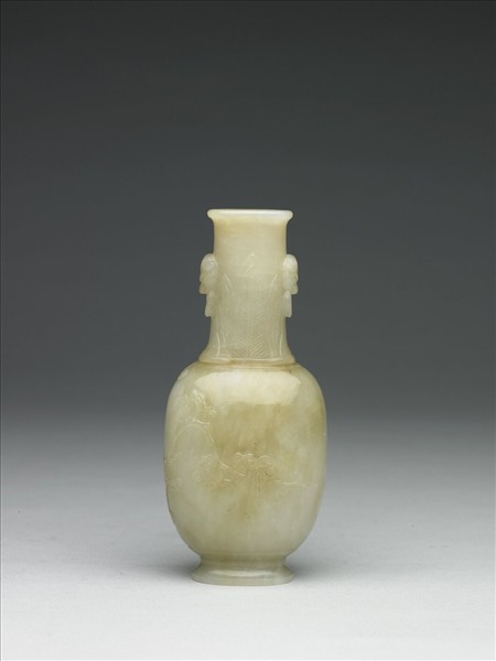 青白玉質,腹部大片沁褐,有璺。侈口,直頸,獸首銜環耳,鼓腹,圈足外撇。頸飾蕉葉紋,腹飾梅花纏繞。