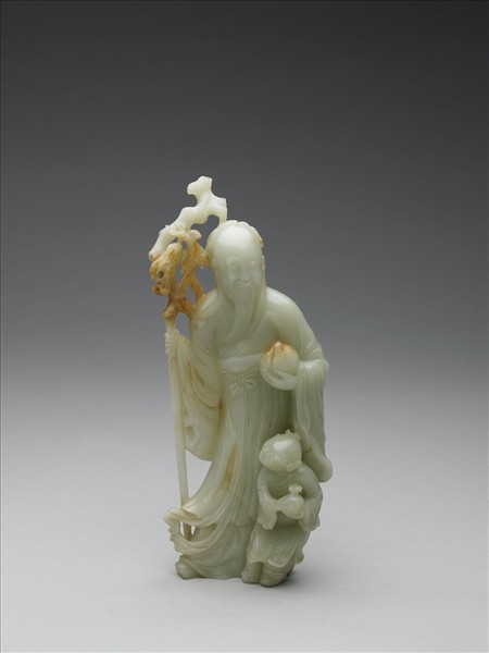 青玉質,雜赭斑,有瑕。全器雕垂鬚老叟,立姿,身形微彎,著寬身長袍,右持佛手枴杖,左捧壽桃。身側琢童子回首仰望,手捧石榴。