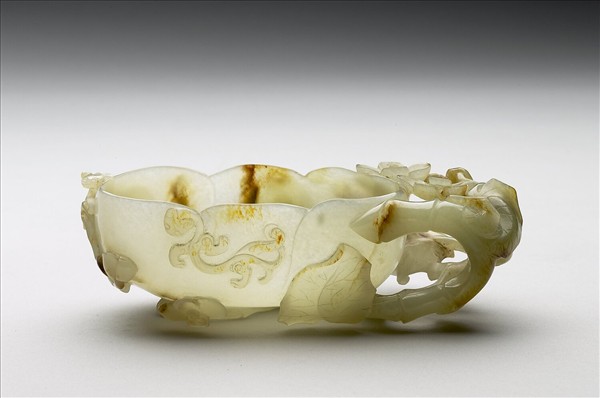 青玉質,帶灰,間有赭斑。全器作海棠花瓣式,呈橢圓形,一端以鏤空枝葉為耳,延伸至器底。口沿處飾蟠螭紋。