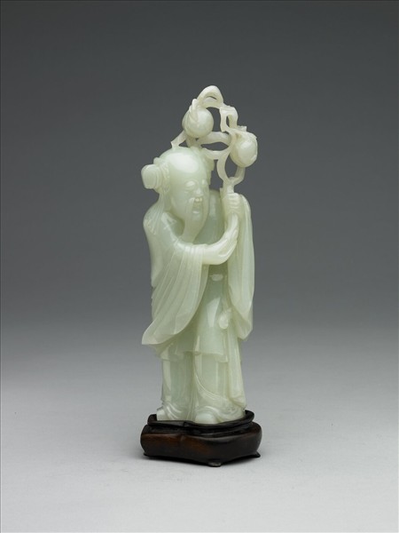 青玉,足底有璺。立雕仙人,附木座,仙人雙髻長鬚,笑容可掬,衣著寬身,手持桃枝為仗,仗首上有兩顆桃實。