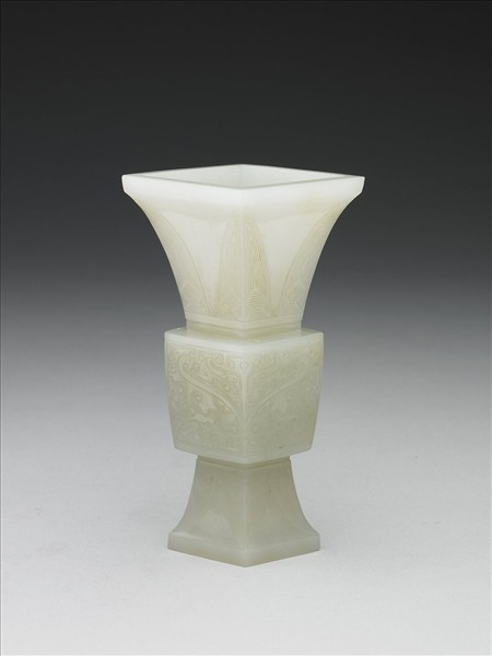 青玉,器足有璺。仿銅方觚,器口呈菱形,脰、足均飾蕉葉紋,腹飾獸面紋。