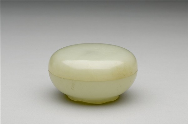 玉質。器作扁圓形,平頂蓋、子母口、淺壁、淺圈足。底飾六瓣花紋。