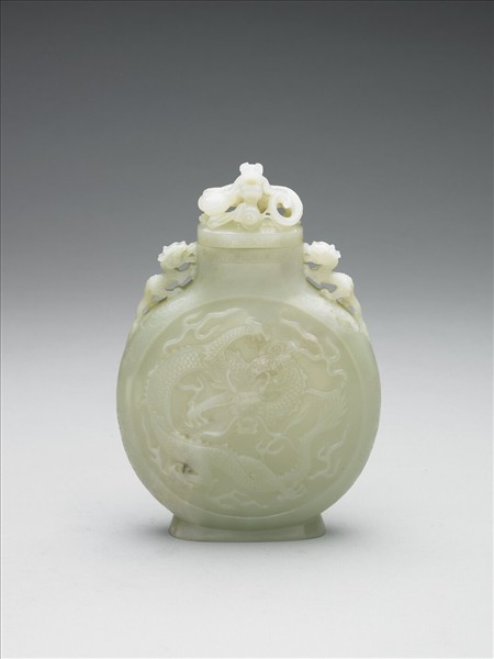 青玉,有璺。全器扁平,附盤龍鈕蓋,橢圓形口、雙龍耳、扁圓腹、圈足。腹飾祥雲蟠龍紋。