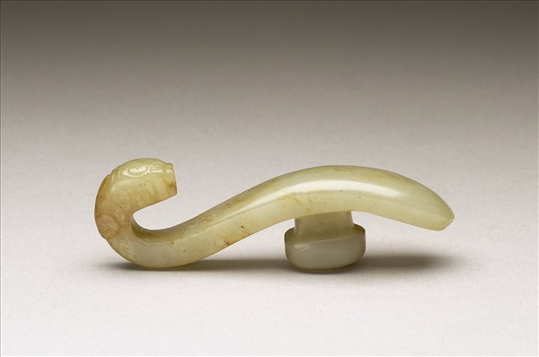 玉質,帶淺黃斑。帶鉤,窄身弧起,首端琢作龍首,背柱作橢圓式。