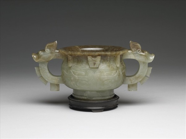 玉質,上沿帶赭斑。仿西周銅簋形。腹琢獸面紋,雙耳作反首龍形。附木座。