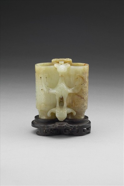 玉質,有赭斑。兩管狀瓶相連,瓶身由上而下依次琢龍紋、雲紋、如意雲頭紋,中間正面浮雕一鷹,足踏一熊,鳥尾和熊尾於背面,還雕一獸面把手。附木座。此類飾以鷹、熊的雙連瓶,取「鷹」「熊」之諧音「英雄」,而有英雄瓶之稱。