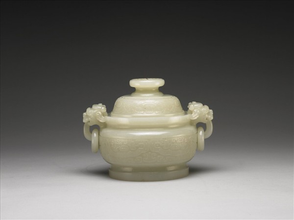玉質。簋形,圈足,雙獸耳下接活環。腹部琢獸面紋,蓋面琢花葉紋,蓋鈕琢一團壽字。