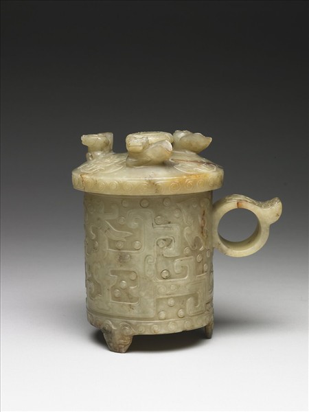 玉泛灰黃,數處裂璺已沁作褐色。造形仿漢代玉卮,器身作直筒杯,單柄、三足,有蓋。器壁上下在口沿及底邊處各琢雲紋一周,中段則浮雕兩隻對望的龍紋,龍體雕作方折迴繞的寬帶紋,隙地則填以穀紋。三個器足、以及英文字母「a」形的器柄上面,均雕琢動物面紋。器底琢變體「冏」紋。器蓋甚為華麗,蓋鈕上端琢一圈繩紋圍繞「冏」紋,高浮雕三隻蹲獸將蓋面平均分隔為三區,各飾以淺浮雕獸面紋。考古資料中,僅在北京師範大學工地的清初黑舍里氏墓出土刻有「子剛」款的明代玉卮一件,相當精緻。與該件可能屬十六世紀陸子剛真跡相比,本院此件年代應稍早,約明代中期風格。
