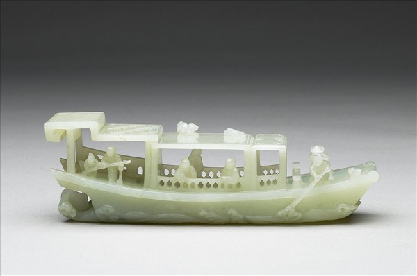 全器立雕人物舟行,四人划槳,三人艙內憑欄觀景。蓬頂飾陰刻細線幾何圖案及如意雲紋,浮雕雙犬坐臥。船下琢波濤紋。