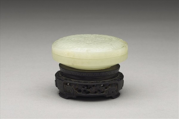 玉質。扁圓形盒,矮圈足。蓋沿及口沿琢回紋一道,蓋面中心淺雕蟠龍紋,四首向四方纏繞,周圍環以側首螭紋。附鏤雕歲寒三友鑲銀絲木座。