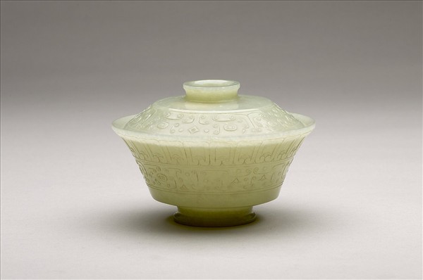 撇口,深壁,圈足外撇,帶鈕蓋。外壁上部琢菊瓣紋一周,器腹下壁與蓋面飾勾連雲紋與獸面紋組成的裝飾圖樣。