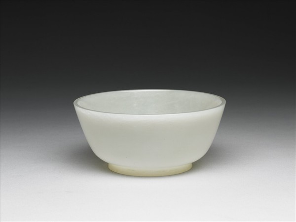 ⽟質。敞⼝,斜壁,矮圈⾜。全器光素無紋。