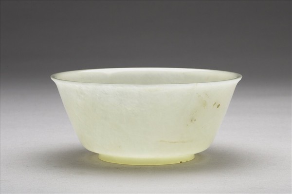 ⽟質。撇⼝,深斜壁,矮圈⾜。全器光素無紋。底有隸款:「乾隆年製」 「⼄」。