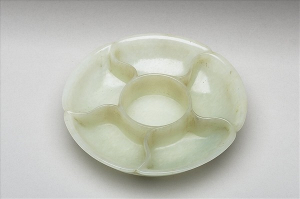 青色玉,琢花式小盤,分中心圓格,外環五瓣形格。口微外撇,淺壁,矮圈足。全器光素無紋。