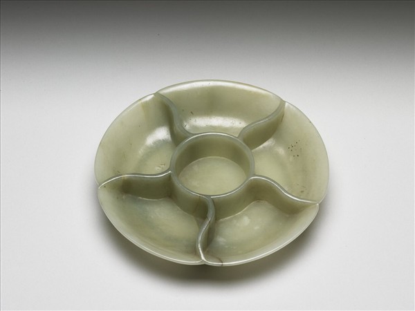 青灰⾊⽟,琢花式⼩盤,分中⼼圓格,外環五瓣形格。⼝微外撇,淺壁,矮圈 ⾜。全器光素無紋。底刻「嘉慶年製」四字隸款。