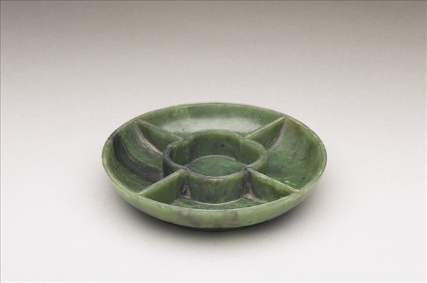 碧⽟,琢圓形⼩盤,中有四瓣海棠花形格,外環四扇形格。全器素⾯無紋。底 刻「嘉慶年製」四字隸款。