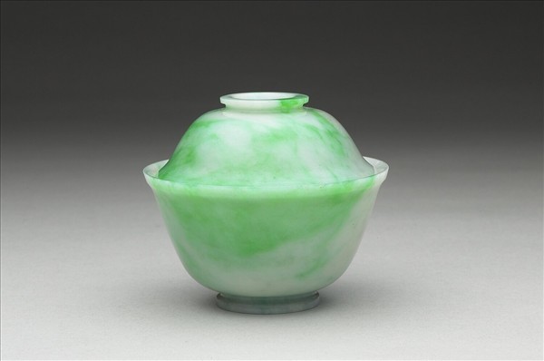翠玉,綠色與白色交雜。口微外敞,深斜壁,圈足,帶蓋,蓋上有圈形鈕。全器光素無紋。