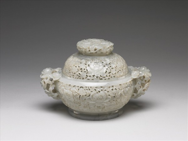 灰白色玉。口有折邊,碩腹,圈足,雙耳,帶鈕蓋。牡丹花紋及其枝葉滿布蓋及腹部,鏤空立雕牡丹花作耳,蓋頂的鈕亦鏤雕三朵牡丹花,紋飾繁複細膩。