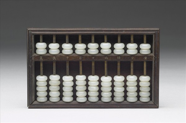 白玉珠共六十三粒,中間有孔,算盤架以壇木製作。背刻「道光年製」,填以金泥。