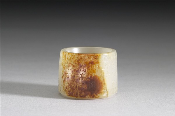 青白玉質,圓筒狀。器面陰刻乾隆皇帝御製詩〈和闐玉韘〉:「嵩高五萬聳崑崙,玉子叢生玉水源。因琢精璆厥貢篚,用成圎韘此闓弴。閉關未可學光武,勝敵聊如識叔孫。馭遠詰戎服海表,不忘意即箇中存。」末題「乾隆御題」,及乾卦陽文圓印、「隆」陰文方印。詩文上下飾帶狀回紋一周。