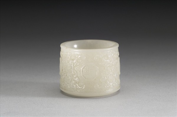 玉質,雕一圓筒狀扳指。器表陰刻「乾」「隆」「年」「製」篆款,外環八角形邊欄。字間重複琢飾展翅鳳鳥立於伏獸之圖樣,地填雲雷紋。