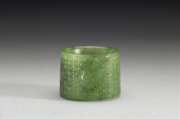 玉質,雕一圓筒狀扳指。器表琢陽文「乾」「隆」「年」「製」篆款,外環八瓣形及圓形雙框。地填竊曲紋。