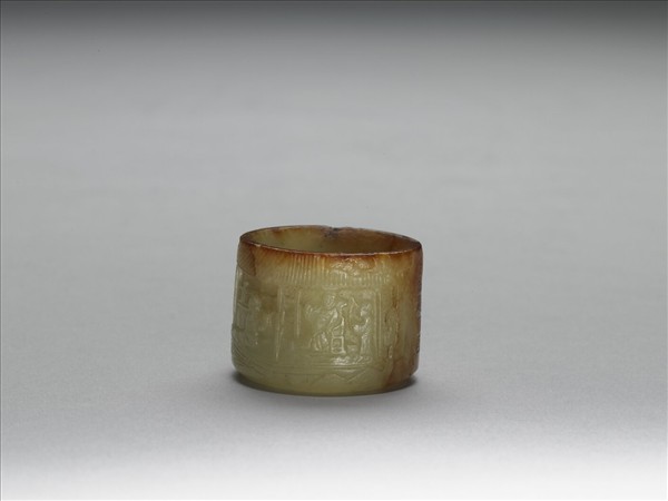 玉質,帶大片黃赭色斑。圓柱形。一面淺浮雕亭閣人物,一面刻乾隆御製詩一首,並有「乾隆戊戌(四十三年,1778)仲夏月御題」,「太」、「璞」等款識。與另外七件玉扳指同儲於漆盒內。
