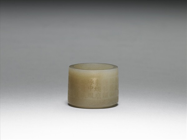 玉質,泛淡赭色。圓柱形。上下沿琢回紋,兩道回紋之間琢七言詩一首,並有「乾隆御題」,「乾」、「隆」等款識。與另外七件玉扳指同儲於漆盒內。