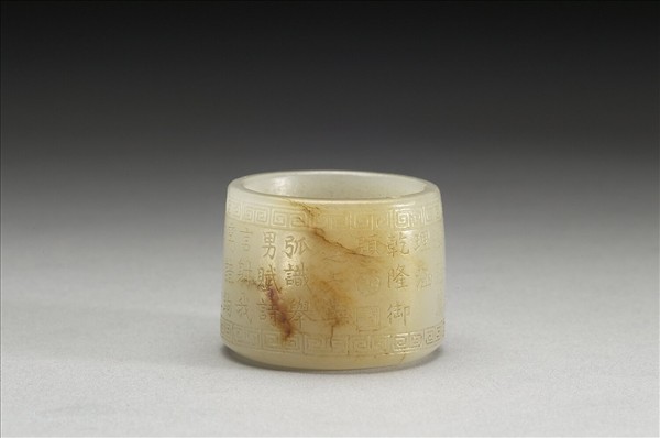 玉質,圓筒狀。器⾯陰刻乾隆皇帝御製詩:「蓬矢桑弧識舉男,賦詩言射我需諳。鉤弦易挽鉤盈六,辨制底須朱極三。終不可諼令德,佩之無數豈虛談。環中內外光明瑩,一氣渾融萬里涵。」並記「乾隆御題」,雕「乾」陽 文圓印、「隆」陰文⽅印。詩文上下飾帶狀回紋⼀周。