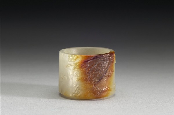 玉質,圓筒狀。器面雕古松鷹雀圖,陰刻乾隆皇帝御製詩〈題和闐玉鷹摷雀韘〉:「一雀鷹摷一避蔵,古松轇轕色蒼蒼。可同射鹿發弦疾,更廑敺林寓意長。」並題「乾隆丁亥御題」及「乾」「隆」陽文方印。