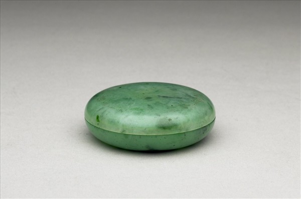 翠綠色玉,帶深綠色斑。扁圓形盒。光素無紋。