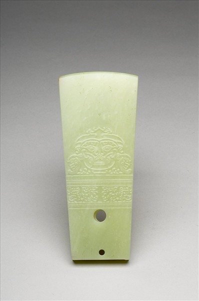 器形為窄長之梯形,刃部厚鈍。在其正面雕琢抽象面紋,並刻乾隆六十年(1795)御製詩一首,另一面則琢具象的面紋,大眼、獠牙、戴船形帽及圓形耳環、耳環下各有一側面的人首,紋飾模仿的相當正確,圭的兩側陰刻楷書「乾隆年製」及「雲字三十三號」。