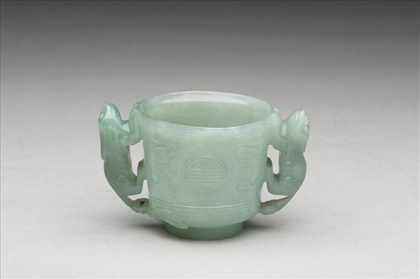 淡藍綠色玉。圓柱形杯體,雙耳,圈足。杯外壁下琢飾回紋,其間浮雕團壽字及蝙蝠,象徵「福壽」之吉祥寓意,雙耳雕作獸形,獸首朝上,攀附於杯上。