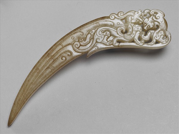 玉質,局部微微受沁呈褐色。由於玉觿形制別具一格,需要發揮巧思才能設計出妥切配合的紋樣,加上玉質細膩完好,所以創作者慎重看待。上端依形制輪廓琢磨出玉熊,收尖的下半段則以弧線營造出層層雲氣,讓破雲而出的神獸乘勢而起,動感十足。