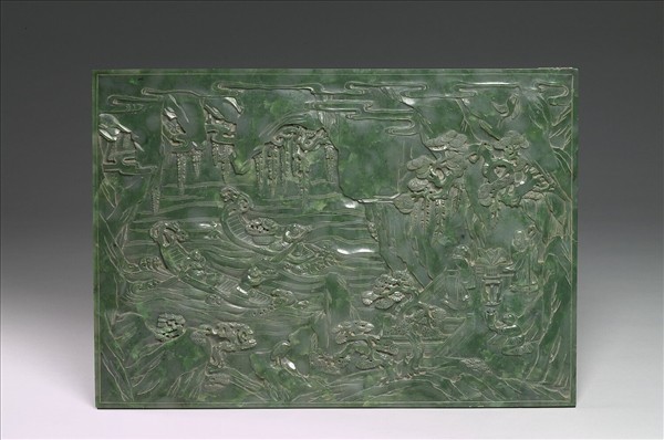 碧玉質,全器作長方片狀。正面雕三名童子乘舟破浪而來,船上裝載靈芝、桃等壽禮;另一端在樓台之上,一位高士及其侍童正向長者獻禮祝賀;前方的鶴,為祥瑞仙禽,寓意長壽。反面琢花葉紋一圈。