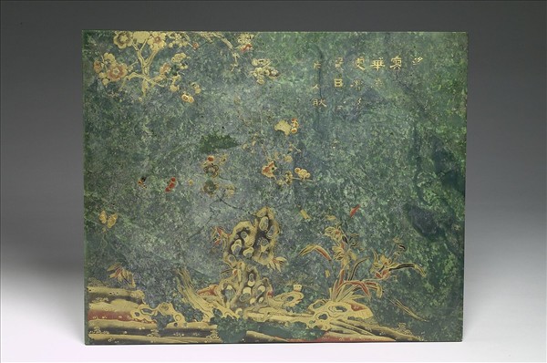 碧玉。作長方片狀,正面有描金梅、蘭、靈芝、湖石等等及御製詩,惟描金剝落不全,反面刻描金「御製平定廓爾喀十五功臣圖贊序」文。