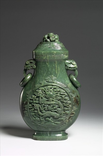 碧玉。圓腹扁瓶,腹部兩面各琢一圓,圓內外浮雕龍飛騰雲彩當中,兩獸耳各啣活環,蓋頂立雕盤龍,蓋面琢雲彩。此器為乾隆時的仿古作品,底有「大清乾隆仿古」六字。