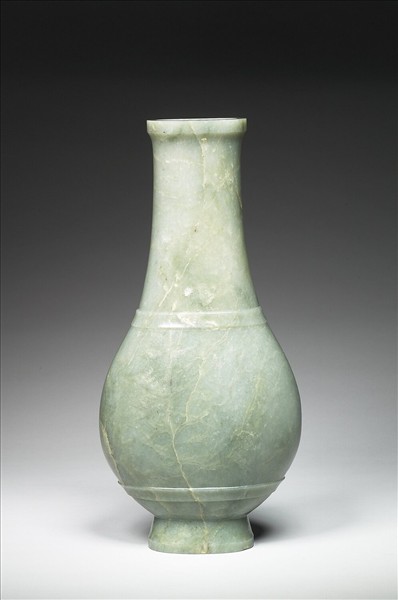 玉質,帶深綠斑。長頸扁瓶,橫切面為橢圓形,腹部上下端各琢一圈帶,樸實素雅。底有「乾隆年製」四字隸款。