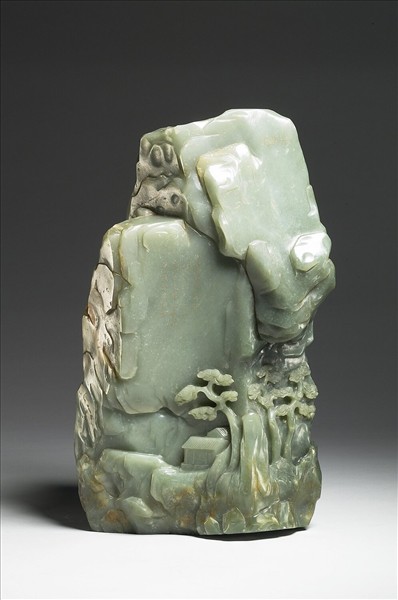此件玉山子雕成巍峨崎嶇的山峰狀。山壁下有松林,林間屋舍為觀看者帶來可居於此的意象。最高峰處刻銘「浮邱峰」,表現了名山刻辭的傳統。其下大片岩壁上刻乾隆皇帝〈御製浮邱峯詩〉:「洞天三十六,黃山峰占足,第一數浮邱,芙蓉四時綠。」