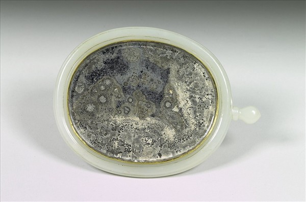 玉琢製而成的橢圓形鏡托,一端有一突出的花蕾造型。正面嵌橢圓形玻璃鏡片,鏡片邊緣鑲金邊一道。全器造型簡潔洗鍊。鄧淑蘋指出此鏡生產於印度。
