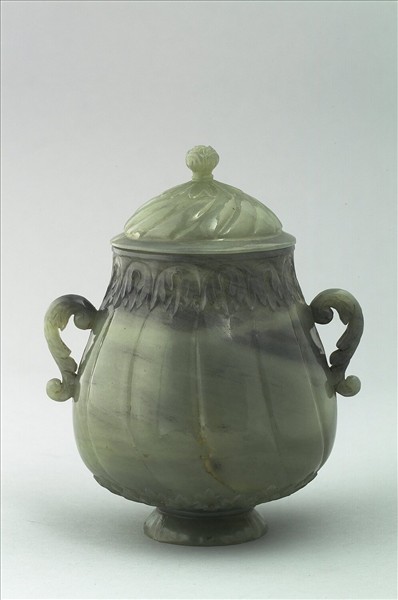 豆綠色玉,帶大片灰黑斑。琢作一造形優美的蓋罐。蓋面及器腹上淺浮雕莨苕葉紋及弧形陰線。雙柄作捲葉形,底部原雕一平展的四瓣花,但外周曾被削去一圈。