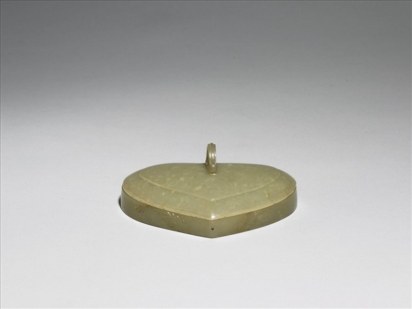 青灰泛黃色玉,琢一既扁矮又寬短的葉形盒,平底。在盒壁靠近葉尖處,各雕莨苕葉一束,向左右斜出。比例上蓋鈕較大,雕一捲曲的莨苕葉。