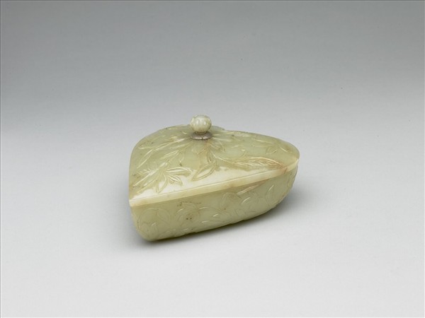 玉質,局部帶淺褐斑。此葉形盒的造形輪廓與雕紋風格都較豪放。蓋面、盒身、盒底都雕琢盛開或成束的蓮花,蓋鈕雕成一朵蓓蕾。