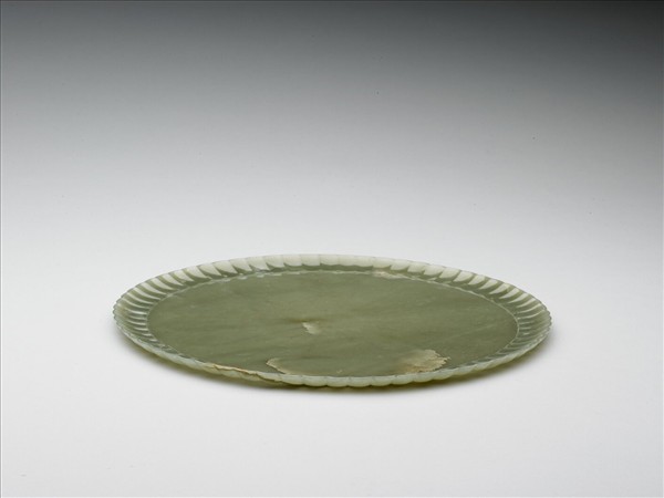 豆綠色玉,琢一頗大的圓盤,邊緣一周排列緊密的短花瓣。盤心光素,盤底雕平展的蓮花,相當式樣化。