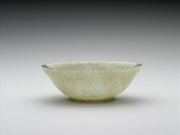 玉質,器略成橢圓形,侈口,深壁、淺圈足,口沿及腹部下端各有一圈葉紋,但雕工頗粗。在南印度德干高原上的Salar Jung Museum收藏不少相似玉碗。