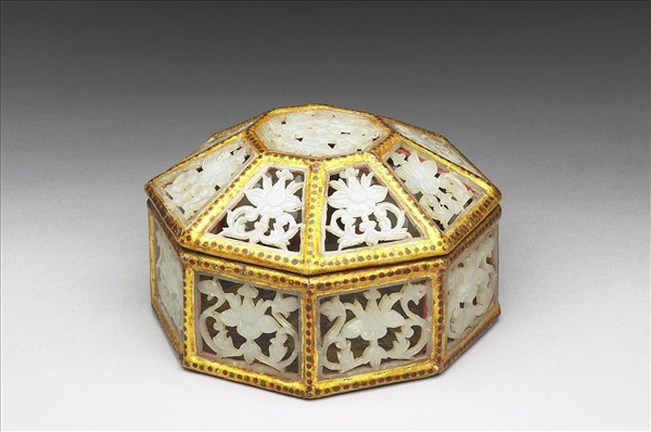 帶蓋的八角形盒,器身與器蓋的主體是金屬條構成的框架,金屬條間嵌飾鏤雕番蓮紋的白玉片。金屬框條表面可能敷以某種紙張類物質,器底可能亦為厚紙板,但在這些紙類表面金、紅、綠等各色顏料圖繪圖案。